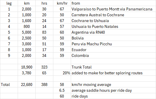 The table below is to give you a BALL PARK idea of km and saddle hours involved to tackle southern AND northern routes (to Machu Picchu) with a loop back to Valparaiso.